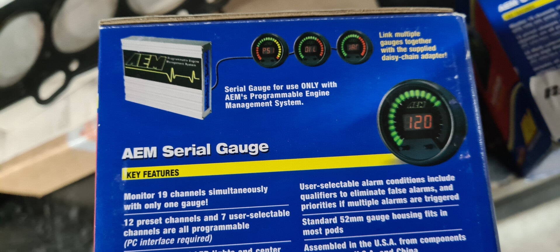 AEM’s Serial Gauge plugs into a Series 2 or Series 1 EMS and has the ability to read up to 19 channels simultaneously. Read boost, AFR, EGT, H20 Temp, IAT, RPM, MPH and more on one gauge with an easy to read, digital LED interface! Users can link multiple Serial Gauges together to divide channel monitoring across several gauges.