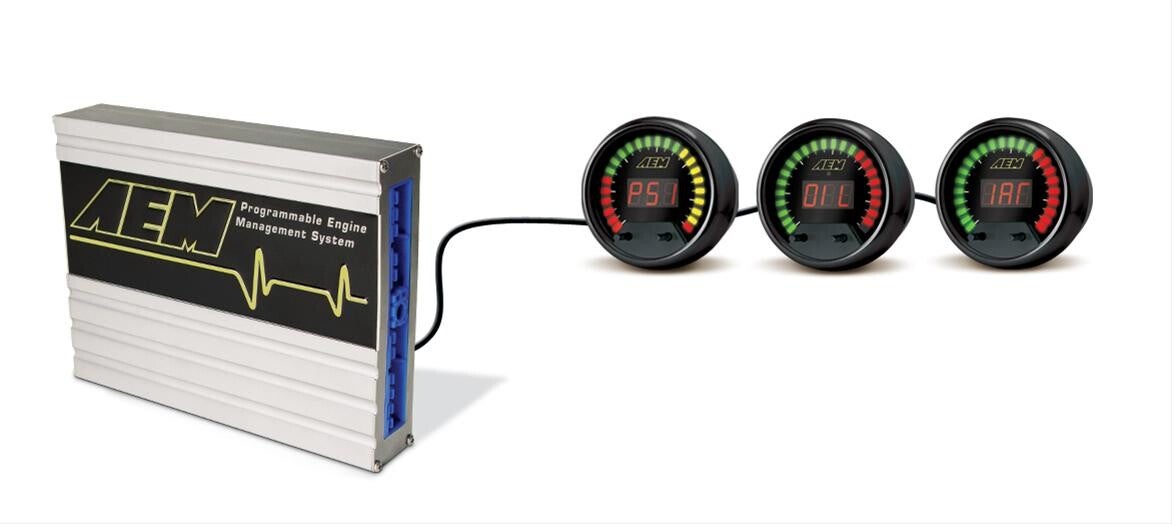 Red, yellow, and green LEDs and the center 3-digit display are fully user-programmable as well, making them truly custom-configurable units. Users can set alarms for each channel so that when the signal exceeds a value, they notify you by flashing all LEDs and switching to the channel where the value was exceeded. User-selectable qualifiers eliminate false warning lights and they include two outputs to trigger ancillary warning lights based on user-selectable conditions. The AEM serial datastream gauges also include user-selectable alarm priority in the event that multiple alarms sound, allowing you to set alarm readouts in your order of priority. Also included are interchangeable silver and black bezels and pin guides and black and white faces for a customizable look. Quick-Connect technology allows you to install them and connect the wiring separately for easy installation and less chance of damage to the circuit board. They include a harness, wiring to connect to the EMS, a daisy-chain adapter for linking multiple gauges to one EMS, and software for a trouble-free installation.